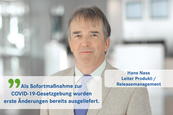 Es sind schon erste CRs gestellt, in der Anforderungsdatenbank dokumentiert und in Abstimmung mit Fachexperten läuft die Umsetzung. So zum Beispiel zum COVID-19-Krankenhausentlastungsgesetz für die Bereiche Krankenhaus, Pflegeversicherung und Ärzte/Zahnärzte. Für den Bereich Krankenhaus (CR 17947) erfolgt in dieser Woche die erste Auslieferung. Weitere Anforderungen werden folgen, so u. a. für den Bereich Beitragseinzug (CR 17949) voraussichtlich auch noch in der nächsten Woche. Wir haben die weitere Entwicklung im Blick, bleiben am Ball und kümmern uns mit Hochdruck um die zeitnahe schnelle Umsetzung und Auslieferung, ggf. per Hotfix.