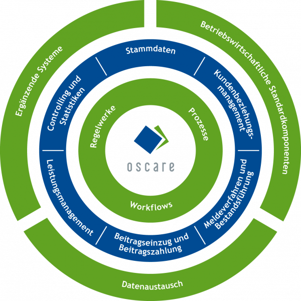 Als voll integrierte Komplettlösung stellt oscare® diese Daten anhand der GKV-Ordnungsbegriffe (z.B. Versicherungsnummer, Betriebsnummer) für alle Geschäftsprozesse einheitlich und aktuell zur Verfügung.