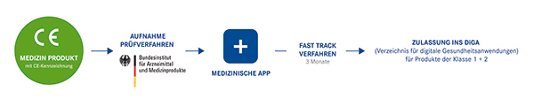 Vor der Aufnahme in das DiGA-Verzeichnis steht das Prüfverfahren des BfArM. Der Hersteller kann dieses beantragen, wenn sein Medizinprodukt bereits über eine CE-Kennzeichnung verfügt. Damit belegt der Hersteller, dass es den gesetzlichen Anforderungen an Sicherheit, Leistungsfähigkeit, klinische Bewertung, Qualitätssicherung und Risikobewertung entspricht. Die Erfüllung aller Anforderungen wird in einem Konformitätsverfahren in Zusammenarbeit mit einer staatlich kontrollierten „Benannten Stelle“ ermittelt. Besitzt also eine medizinische App diese Kennzeichnung, kann die Zulassung ins DiGA-Verzeichnis mithilfe des Fast-Track-Verfahrens beim BfArM innerhalb von drei Monaten erfolgen. Allerdings gilt das nur für DiGAs, die zu den Medizinprodukten der Klasse 1 und 2 gehören.
