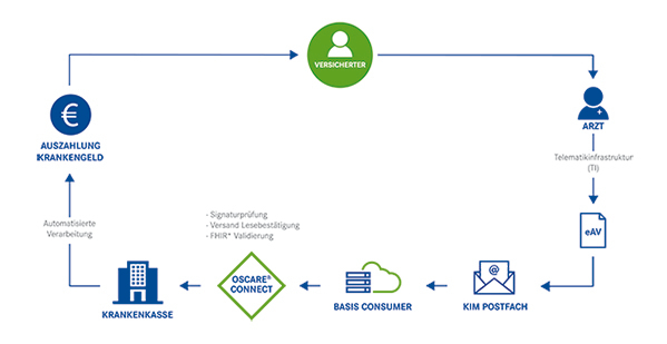Die eAU ist eingeführt worden! Der Versand elektronischer Arbeitsunfähigkeitsbescheinigungen vom Arzt zur Kasse. Dank ihrer Anbindung an die Telematikinfrastruktur (TI) schicken Ärzte eAU-Nachrichten auf digitalem Wege auf die Reise. Jene E-Mails landen zunächst im KIM-Postfach der Kasse. KIM ist das Synonym für Kommunikation im Medizinwesen und gilt als ein wesentlicher Bestandteil der TI. Über den Basis-Consumer, in dem die Entschlüsselung erfolgt, betritt die eAU erstmals die Schwelle in den Einflussbereich der Kasse: hin zu oscare® connect. An dieser Stelle folgen einige „technische Schritte“, von denen hier nur die wichtigsten aufgezählt werden können: Signaturprüfung und Versand von Lesebestätigungen. Noch dazu die FHIR®-Validierung. FHIR® ist die Abkürzung von Fast Healthcare Interoperability Resources – es handelt sich dabei um jenes XML-Format, in dem die AU bei der Kasse eingeht. oscare® connect transformiert dieses ins bekannte JSON-Format und leitet die eAU an die Backend-Systeme weiter.