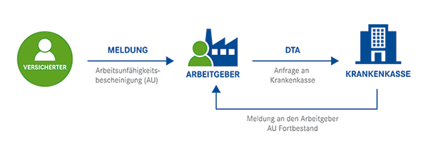 Warum muss sich Frau M. um gar nichts mehr kümmern? Während bisher eine Arbeitsunfähigkeitsbescheinigung für Zwecke des Arbeitgebers ausgestellt wurde und dort vorzulegen war, wurde auch dieses Verfahren durch ein digitales abgelöst. Erhält der Arbeitgeber Kenntnis über eine AU, schickt er per Datenträgeraustausch (DTA) eine Anfrage an die zuständige Kasse, ob denn tatsächlich zum genannten Zeitpunkt Arbeitsunfähigkeit vorliege. Da die Kasse just in time per eAU-Nachricht über selbige informiert wurde, erfolgt umgehend eine entsprechende Antwort der Kasse an den Arbeitgeber. Somit fällt die Pflicht des Nachweises einer AU in die Hände der Krankenkassen.