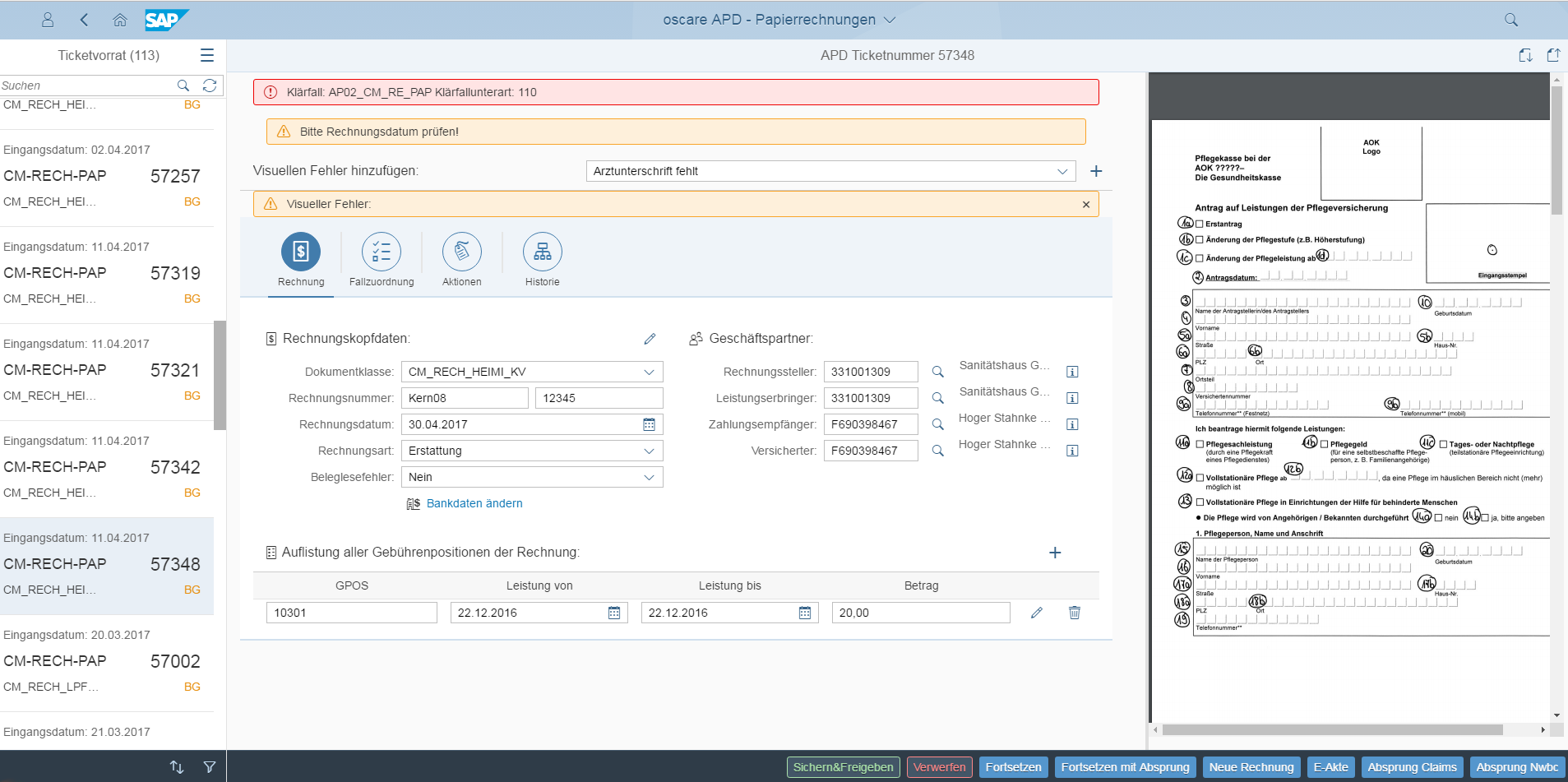 Papierrechnungen stellen auch im Zeitalter des Datenträgeraustauschs noch eine erhebliche Herausforderung für die Krankenkassen dar. Ein jährliches Belegaufkommen von mehreren Hunderttausend Belegen – allein auf den Bereich Pflege bezogen – lässt erahnen, welch ein gewaltiger Aufwand für die Transformation dieser Belege in oscare®-Rechnungen investiert werden muss. Rechnet man andere papierbasierte Rechnungsprozesse und Erstattungsanträge durch Kunden hinzu, so kann die Größenordnung des betroffenen Belegguts leicht im Millionenbereich liegen. Papierrechnungen und Erstattungsanträge werden heute entweder händisch in oscare® erfasst und bearbeitet oder über ein schlichtes Posteingangsverfahren in digitalisierter Form bereitgestellt; wobei die Erfassung dann trotzdem noch händisch erfolgen muss. Beide Vorgehensweisen sind personalintensiv. Dadurch nutzen die Kassen nicht annähernd das Potenzial der Fachspezialisten. oscare® DiREP smart schafft hier Abhilfe. Die von der Beleglesung übergebenen Dokumentarten für mehrere Dutzend unterstützte Teilfallarten werden nach Validierung der Daten – im Problemfalle – als Klärfall auffällig. Für die Bearbeitung steht ein FIORI-Klärfalldialog zur Verfügung, der mit dem Anspruch „alles Relevante im Blick“ konzipiert wurde.