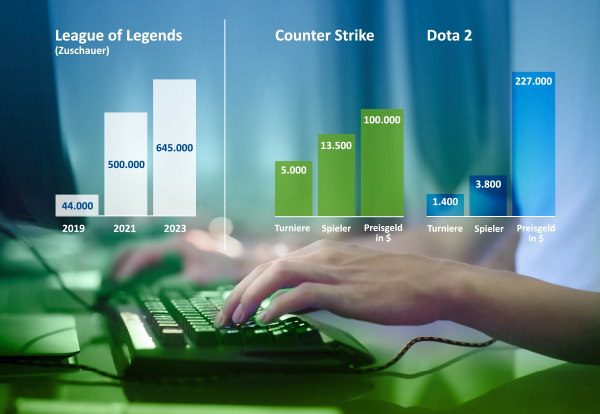 Aber nicht nur die Einnahmen der E-Sport-Profis sind mit Sport-Profis vergleichbar, sondern auch deren Lebensumstände. Die meisten professionellen E-Sportler spielen für ein Team, hinter dem große Vereine aus dem Fußball, Football oder Basketball, große Unternehmen oder spezielle E-Sport-Firmen stecken. Das Team SoloMid hat etwa einen aktuellen Marktwert von über 400 Millionen Dollar. Die Spieler haben Trainer, Physiotherapeuten, Ernährungsberater, es gibt Spielerberater und Ablösesummen. Das wichtigste Spiel der E-Sport-Szene ist der Ego-Shooter „Counter-Strike“ mit über 13.000 Profispielern. In über 5.000 Turnieren wurden bisher über 100 Millionen Dollar Preisgeld ausgelobt. „Dota 2“ hat zwar nur rund 3.800 Profispieler, allerdings sind die Preisgelder deutlich höher: 227 Millionen wurden in rund 1.400 Turnieren vergeben. Ebenfalls unter den Top 5 sind die Spiele „League of Legends“ und„Fortnite“. Nicht nur die Preisgelder sind enorm hoch, sondern auch die Zuschauerzahlen. 2019 sahen rund neun Millionen das Wimbledon-Finale, bei der „League-of-Legends-WM“ im gleichen Jahr sahen in Spitzenzeiten 44 Millionen zu. Seitdem sind die Zuschauerzahlen nicht nur durch Corona gestiegen. In diesem Jahr rechnet die Branche mit etwa 500 Millionen, im Jahr 2023 sollen sie bis auf 645 Millionen steigen.