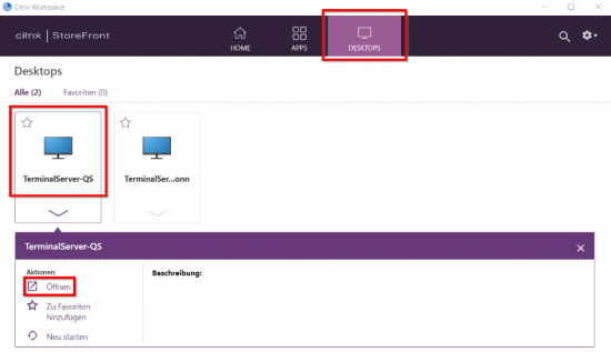 Über die Kachel „DESKTOPS“ kommen Sie zum benötigten TerminalServer-QS. Hierüber erreichen Sie die Arbeitsoberfläche der AOK Systems (dies kann einige Minuten dauern):