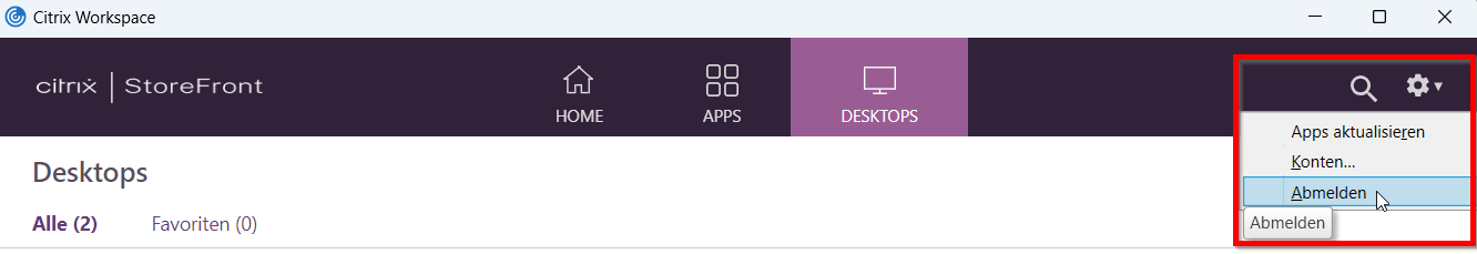 Wenn Sie sich abmelden möchten, gehen Sie dazu wie gewohnt auf das Microsoft Start-Icon innerhalb des Desktops. Sie sehen anschließend wieder die Oberfläche „Citrix StoreFront" und können sich dort vollständig abmelden: